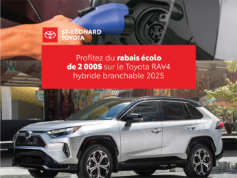 Chez St‑Léonard Toyota, nous sommes parfaitement alignés avec vos objectifs écologiques et financiers. Notre équipe peut vous guider pour confirmer l’admissibilité du rabais sur le RAV4 hybride branchable XSE 2025, s’assurer que le rabais soit bien appliqué dans votre contrat, et vous conseiller sur les meilleures modalités de financement ou de location. Grâce à ce rabais, vous pouvez faire l’achat d’un VUS performant, branchable et économique, tout en bénéficiant d’un support professionnel pour maximiser vos économies.
